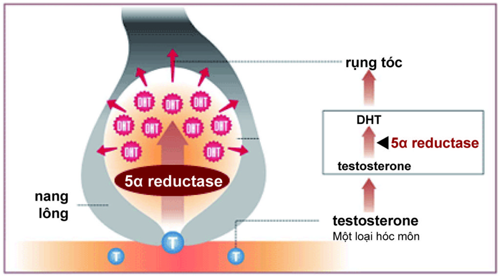 Tác nhân chính gây ra AGA (chứng hói đầu ở nam giới) là DHT (dihydrotestosterone) trong chân tóc. AGA đã xác nhận một lượng lớn DHT trong vùng rụng tóc. DHT được tạo ra từ nội tiết tố nam testosterone bởi 5α-reductase, và mức độ cao của DHT này sẽ kết thúc giai đoạn phát triển của tóc. Kết quả là, tóc rụng trước khi mọc thành tóc dày, nhiều sợi tóc mỏng và ngắn trở nên mỏng.