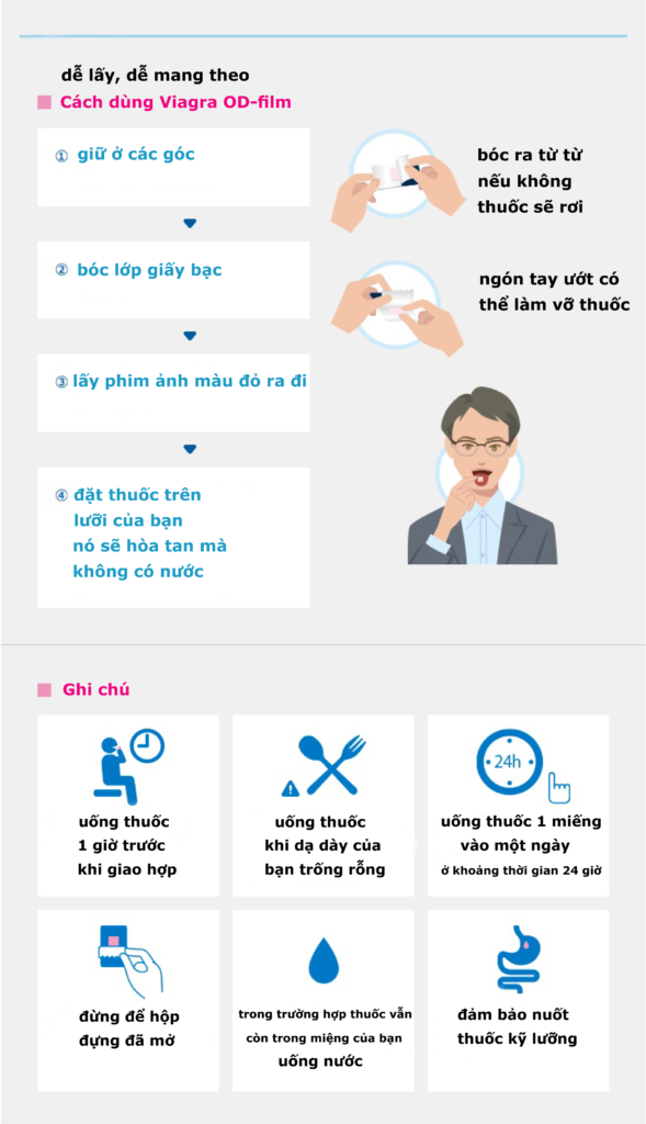 Pfizer phát hành Viagra OD film vào ngày 21 tháng 10 năm 2016. Đây là dạng thuốc có thể uống không cần nước giống như viên nén sildenafil OD của Towa Pharmaceutical, nhưng nó được sử dụng dưới dạng một màng mỏng nên dễ dàng cho vào. một chiếc ví. Có vẻ như bạn cũng có thể sử dụng nó bằng cách ghi vào sổ tay. Các thành phần giống như Viagra. Thuốc Viagra 50mg của Pfizer có giá cả phải chăng hơn so với thuốc viên.